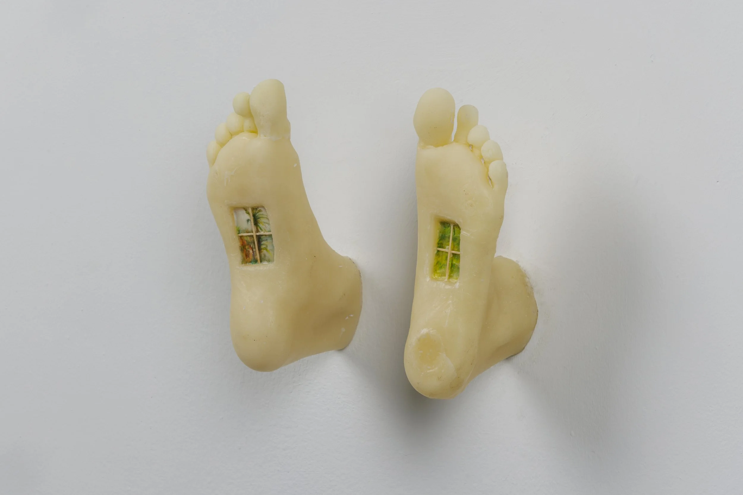 Two small decorative sculptures of human feet with miniature window scenes in the arch area of each foot, mounted on a white background.
